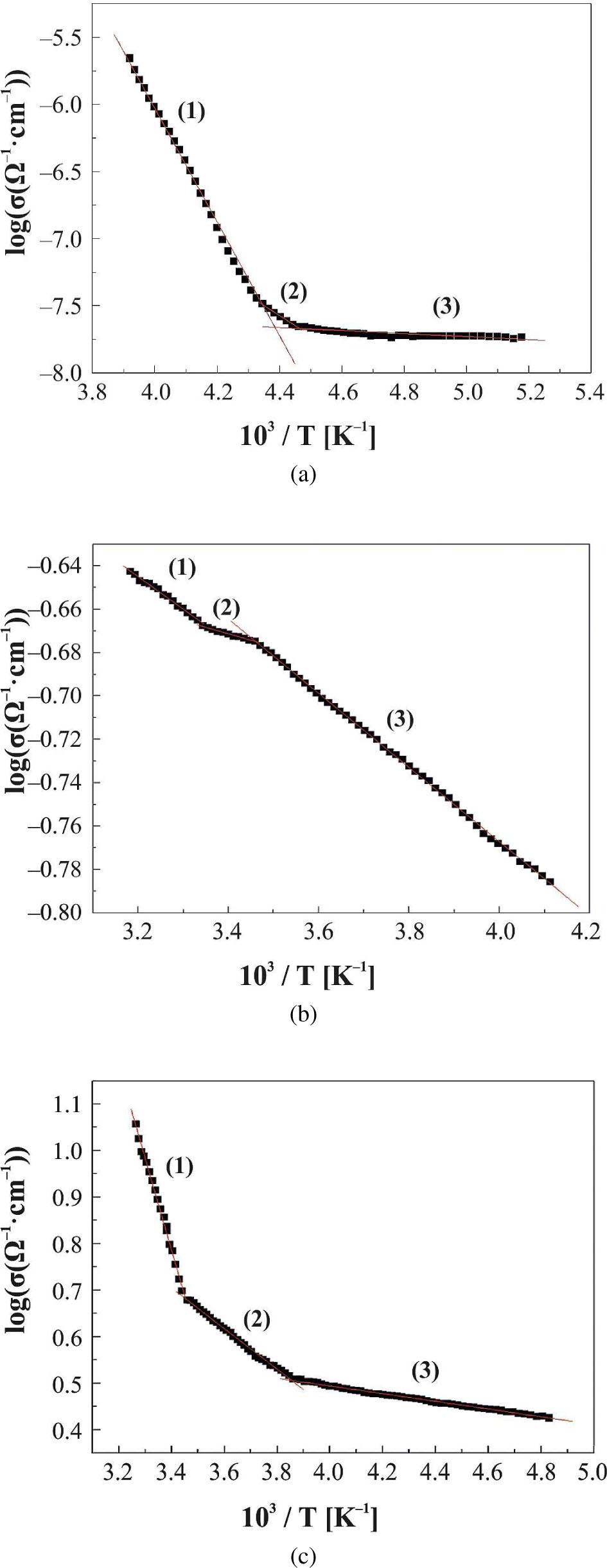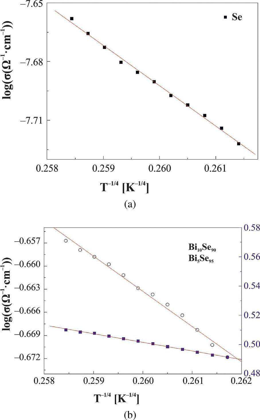 Linear fit of the data shown in Fig. 4 indicates that temperature dependence of the conductivity in this temperature range satisfies Mott’s formula. Straight lines parameters were used to calculate N(Ef) and consequently to calculate the basic parameters characterizing VRH conduction, namely the hopping distance Rh is given by [15]: