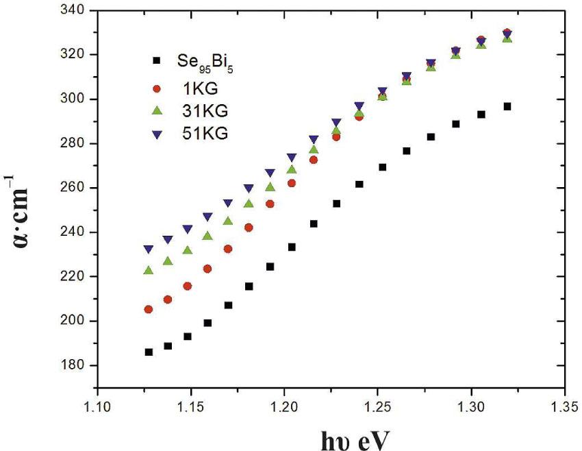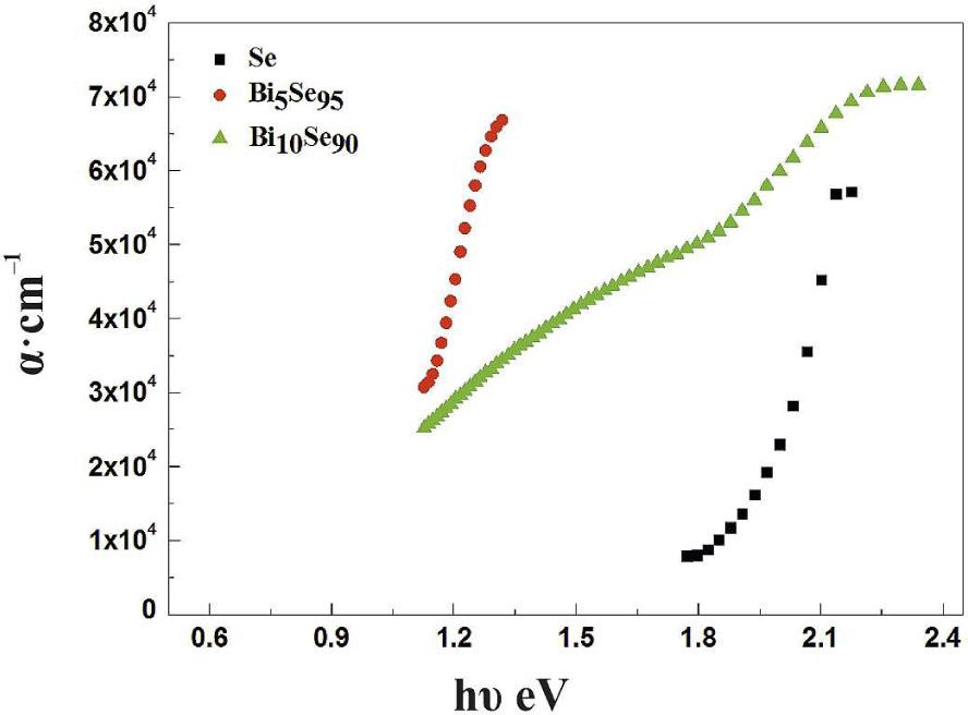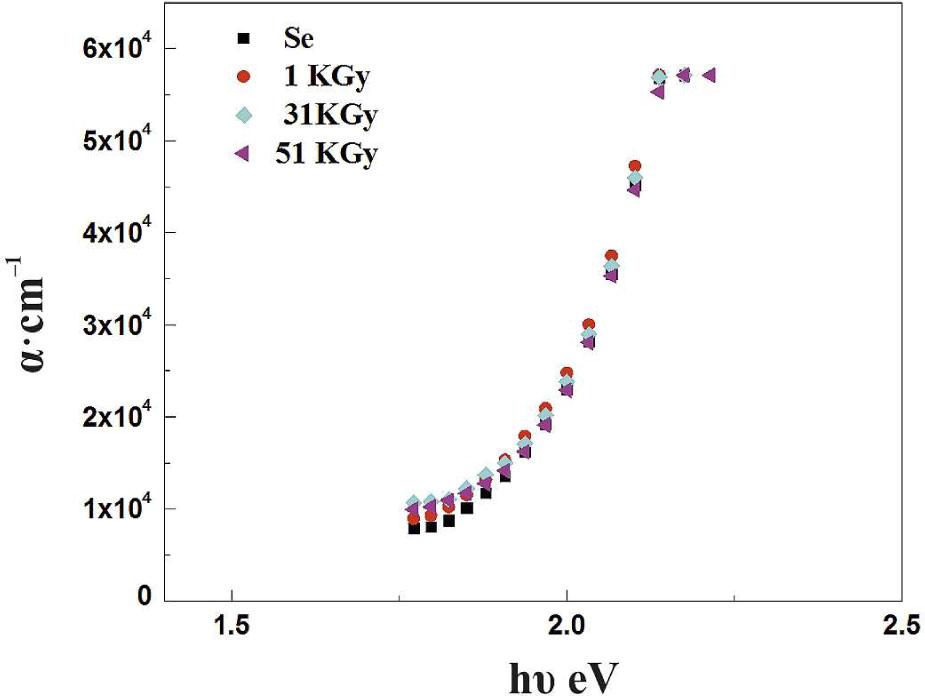 where a0 is a constant, w is the angular frequency of incident photon, h is the Planck’s constant and Ee is the width of band tail of localized states. The calculated values of the Ee are listed in Table 4. It is clear that the steepness of the absorption edge is changing and a red shift in the absorption edge is observed due to introducing Bi atoms. According to [7], the red-shift is associated with the p-n transition or CTR. Also, addition of Bi to Se has an effect of increasing randomness and hence, a consequent increase in the localized states in the gap. Increasing the number of localized states in the gap increases the electronic transition probability leading to narrowing the band gap. Also, the red shift of the absorption edge could be related to the structural changes resulting from Bi addition [19]. The effect of γ-irradiation on optical absorption was studied for five irradiation doses up to 51 kGy. The results are tabulated in Table 4. Variation of absorption coefficient of Se thin film with the incident photon energy, for three γ-irradiation doses is shown in Fig. 7. It is clear that there is a shift in the absorption edge towards lower energies