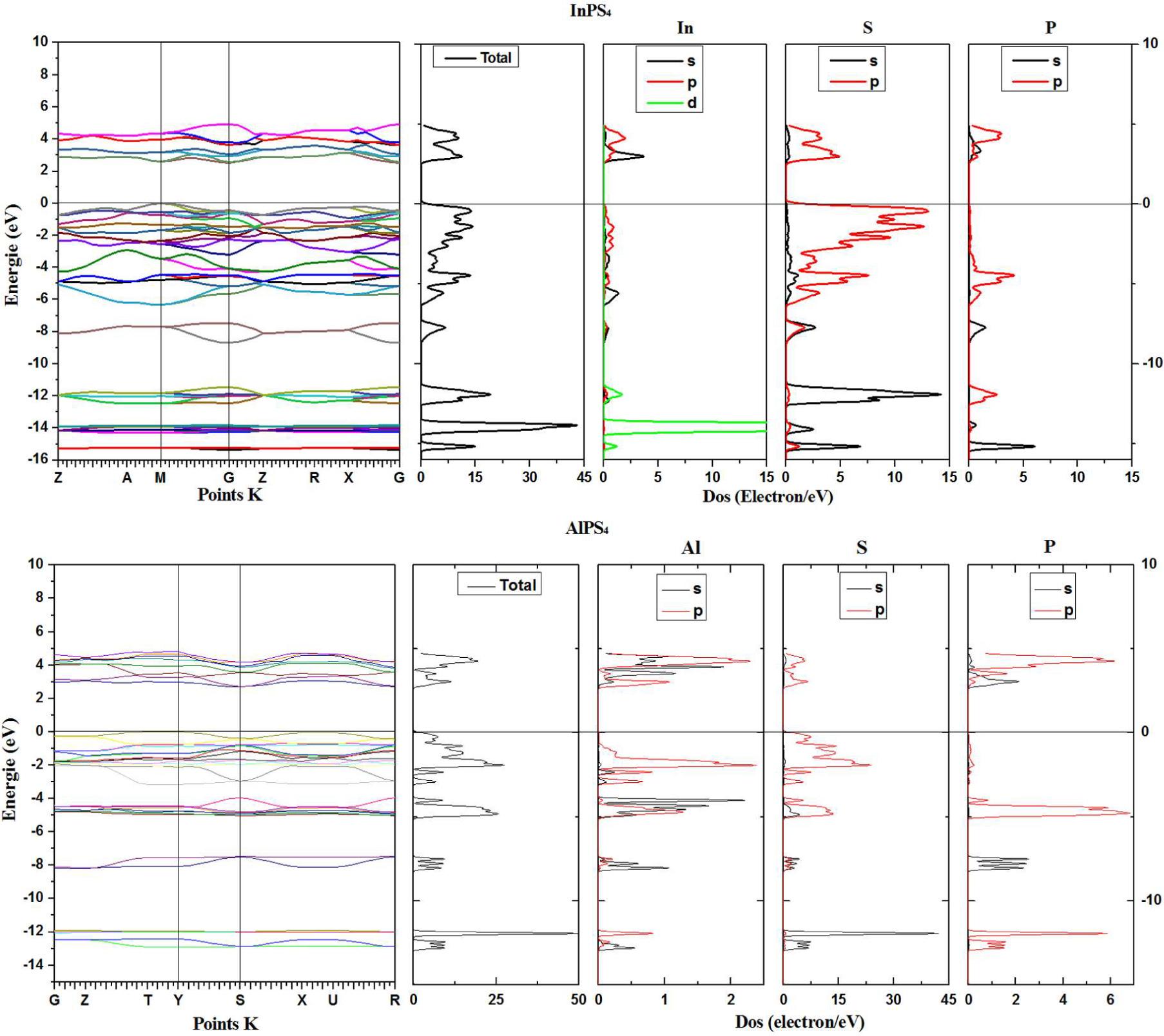 Band structures, total and partial Dos of InPS4 and AlPS4.
