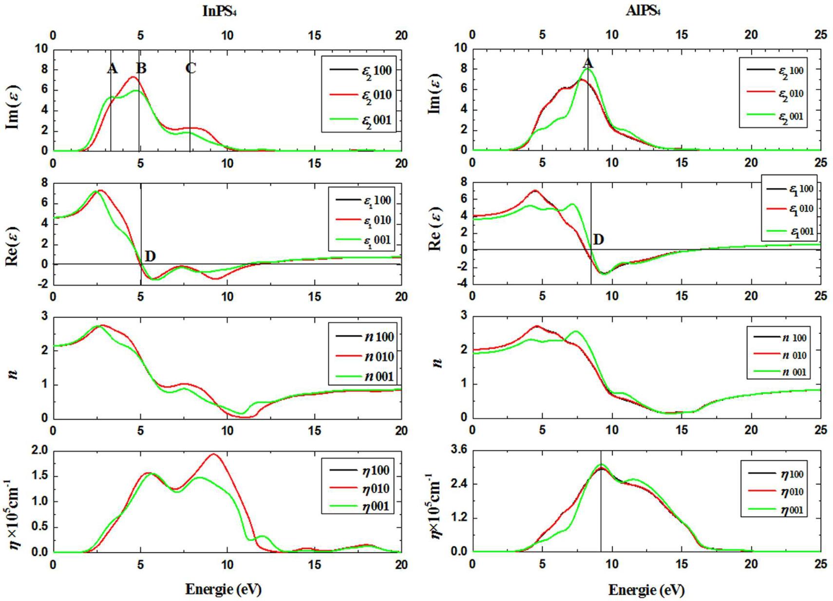 We can also see similarities and differences between ε100(ω) and ε001(ω). The similarities are as follows: for low frequencies, which correspond to energies less than band gap energy (Eg(InPS4) = 2.33 eV, Eg(AlPS4) = 2.70 eV),