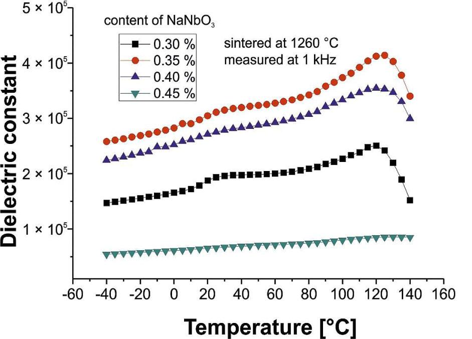 Fig. 1 shows the dielectric constants of the NNBT ceramics sintered at 1260 °C with 0.30 mol%, 0.35 mol%, 0.40 mol%, and 0.45 mol% NaNbO3 content at 1 kHz. The samples of BT doped with 0.35 mol% and 0.40 mol% NaNbO3 have larger dielectric constants, therefore for general considerations the doping content of 0.40 mol% NaNbO3 was chosen to be investigated in detail.