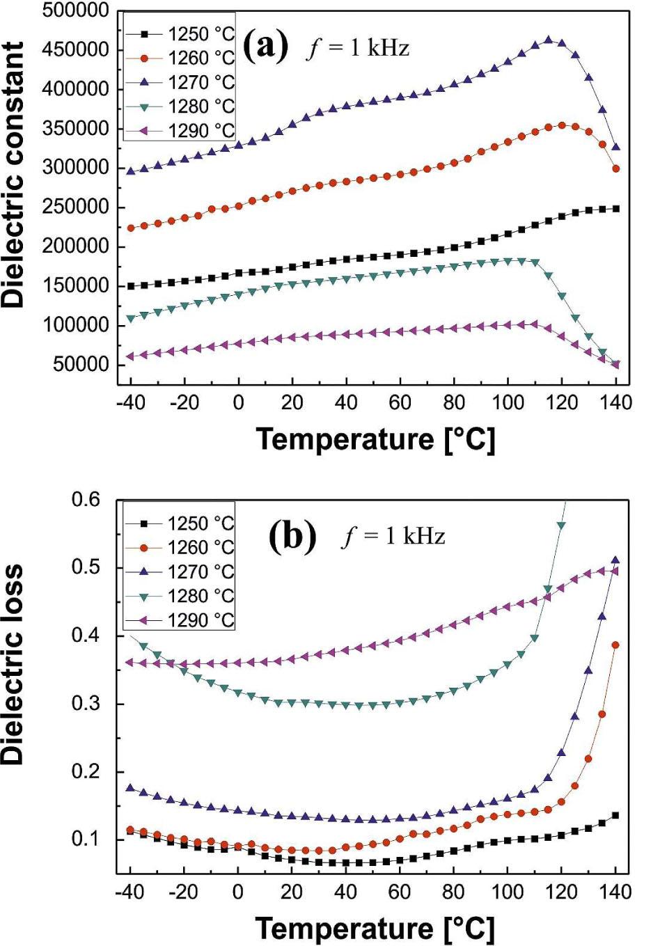 Fig. 2 demonstrates dielectric permittivity versus temperature of 0.40 mol% NN-BT ceramics at different sintering temperatures measured at 1 kHz. The dielectric constant increases with sintering temperature from 1250 °C to 1270 °C and the peak value of dielectric constant of the sample sintered at 1270 °C is 4.5 × 105 as shown in Fig. 2a, while the dielectric loss (Fig. 2b) is less than 0.2 at temperature range from −40 °C to 100 °C. For the sample of NN-BT sintered at 1250 °C, the dielectric constant is only half of the value of the sample sintered at 1270 °C, the temperature coefficient of capacity ∆C/C ranges from −15.4 to +16.7 in the temperature range of −40 °C to 90 °C and the dielectric loss is also almost half of the sample sintered at 1270 °C. When the sintering temperature is higher than 1270 °C, the dielectric constant of NN-BT samples decreases rapidly, and dielectric loss increases significantly.