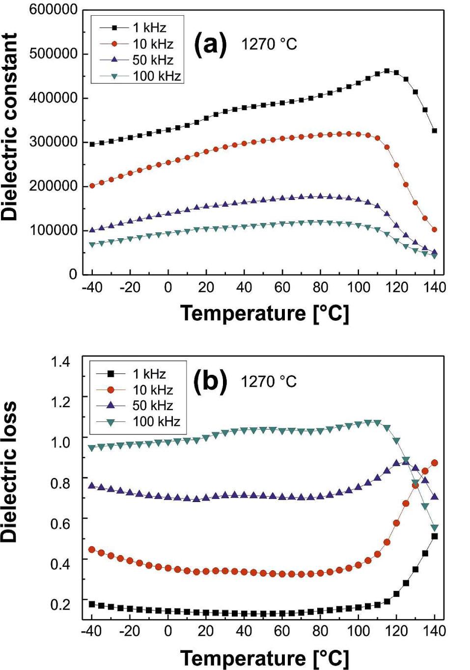 Fig. 3a and Fig. 3b represent the dielectric constant and dielectric loss versus temperature at different frequencies for the sample sintered at 1270 °C. There is a large decrease in dielectric constant and increase in dielectric loss with frequency in the sample sintered at 1270 °C. When the frequency increases from 1 kHz to 100 kHz, the value of dielectric constant decreases from 450000 to 100000 and the dielectric loss increases from 0.2 to 1.0 at Curie temperature (115 °C). The double peak phenomena appear in both dielectric constant and loss curves leading to good temperature stability of the sample.