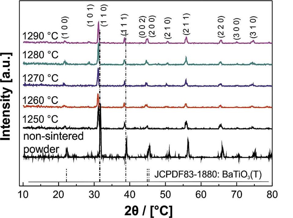 NaNbO3 can incorporate into BaTiO3 lattice in a large proportion to form NaxBa1−xTi1−xNbxO3 solid solution. However, sodium ions have a tendency to accumulate on the grain surfaces at higher temperatures [7]. Pure NaNbO3 grains with a size of 2 µm can be formed only at sintering temperature of 1200 °C [8]. Therefore, the sintering temperature was controlled between 1250 °C to 1290 °C to form a solid solution of NaNbO3.