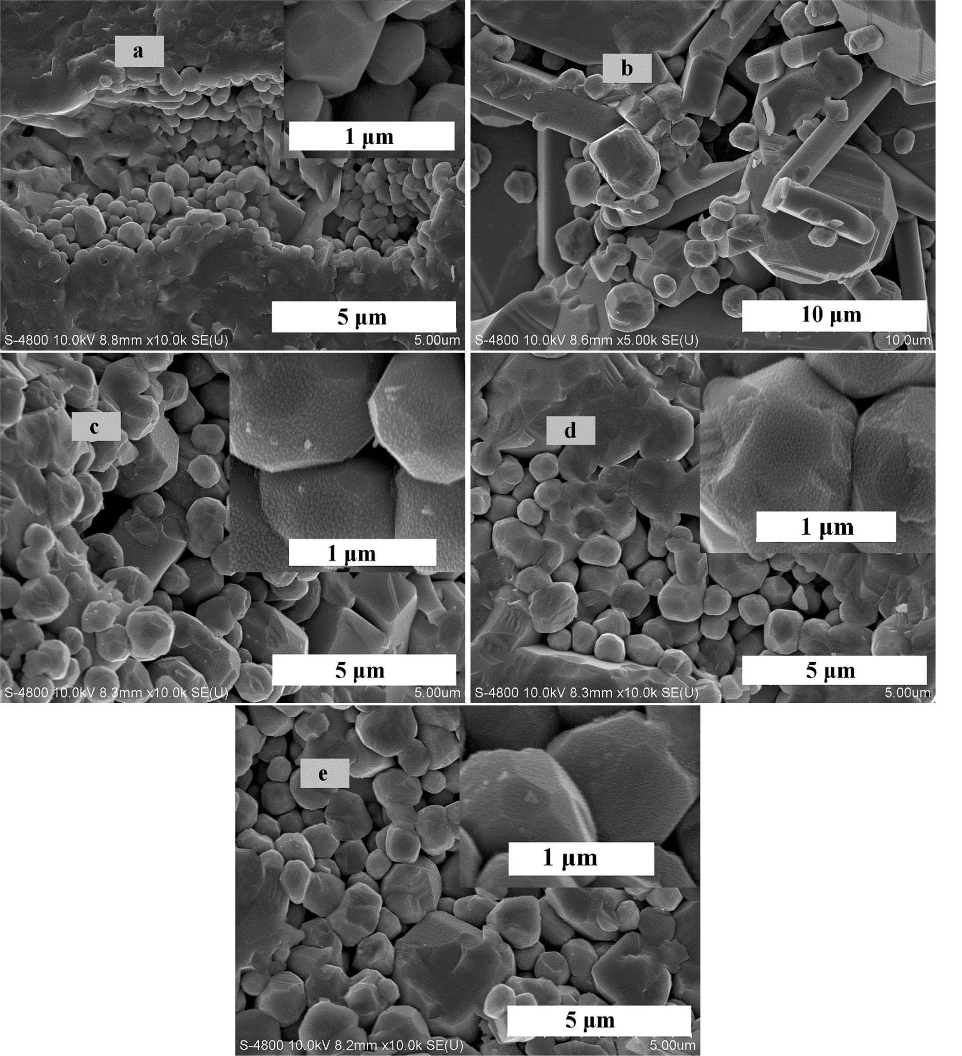 Fig. 5a shows the grain distribution of the NN-BT ceramics sintered at 1250 °C. The average size of the grains is less than 0.4 µm with dense areas, which is due to the melting of NaNbO3 at 1460 °C. Fig. 5b shows that when sintering is carried out at temperature of 1260 °C the shape of the grains is clearer and part of the regions appear overgrown. When the sintering temperature is equal and higher than 1270 °C, the white substance on the grain surface begins to precipitate, forming white spots as shown in Fig. 5c. With the rise of temperature (1280 °C and 1290 °C), the precipitate density increases, and the grains grow uniformly as indicated in Fig. 5d and Fig. 5e. Comparing with the results of XRD, the white precipitate material may correspond to the small peak at 28° in the XRD patterns.