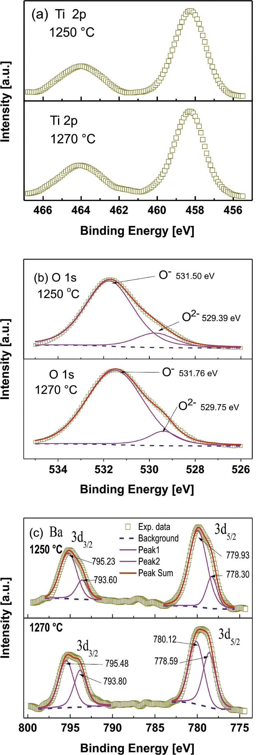 XPS of NN-BT samples sintered at 1250 °C and 1270 °C: (a) Ti 2p, (b) O 1s, (c) Ba 3d.