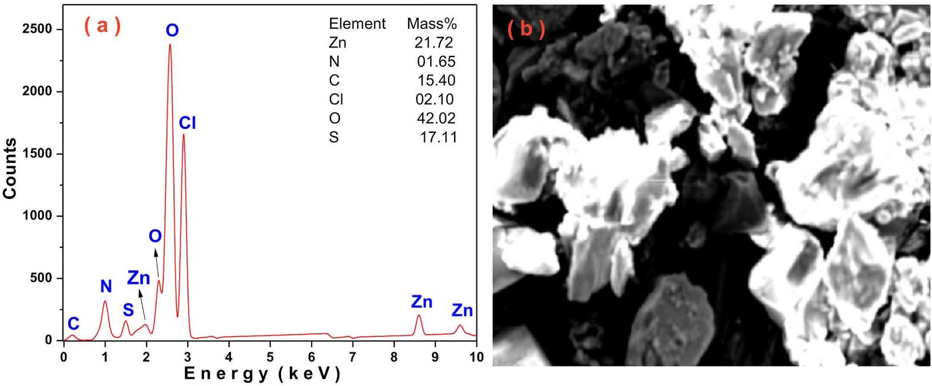 (a) EDS spectrum of LA-ZTC crystal, (b) SEM micrograph of LA-ZTC crystal.