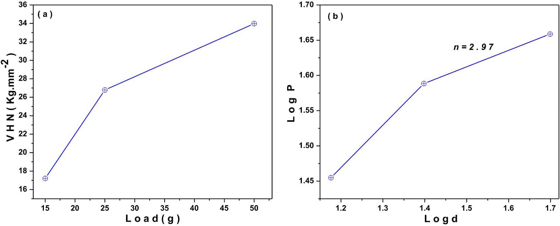 The Vicker’s microhardness study has been done using a Shimadzu HMV-2T microhardness analyzer to assess the mechanical properties of LA-ZTC crystal. The Vicker’s hardness number (VHN) of LA-ZTC crystal has been determined at different indentation loads using the relation: Hv = 1.8544 P/d2 kG/mm2, where P is the applied load in kG and d is the average indentation diagonal length in mm [10]. The VHN for each load applied for a constant period of 5 sec is plotted in Fig. 3a. It reveals that the hardness of LA-ZTC crystal increases with the applied load which confirms that the stress required for homogeneous nucleation of lattice dislocations is larger for higher load. The work hardening coefficient (n) of material depends on the dislocation movement in the crystal system for which Meyer’s law, P = Kdn can be employed [11]. The n of LA-ZTC crystal has been determined from the slope of the plot of logP vs. logd, shown in Fig. 3b. The magnitude of n has been found to be 2.97, and such materials falls to the category of soft materials obeying the Onitsch criterion [12]. In proper selection of materials for high-edge mechanical device fabrication the elastic stiffness constant