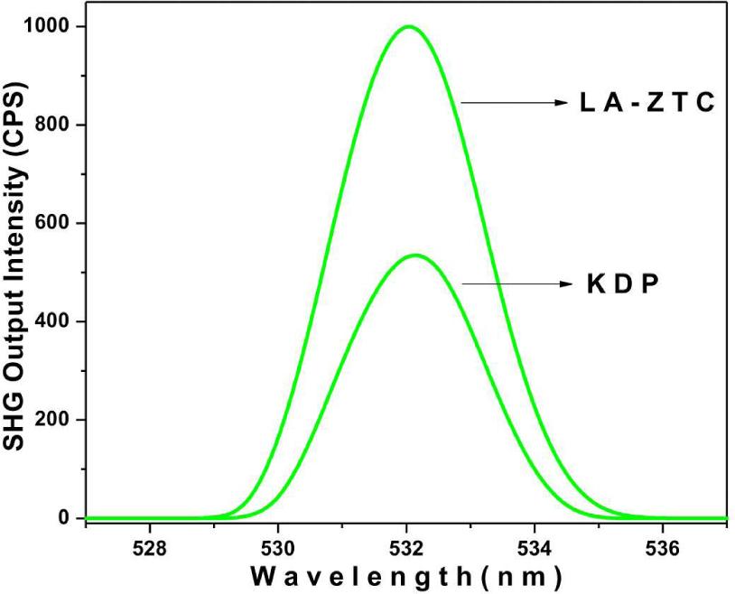 The Kurtz-Perry powder SHG test is a decisive technique to determine the second order conversion efficiency of given material [15]. For present analysis, the single KDP and LA-ZTC crystals were powdered to micro-granules of even grain size and tightly packed in a quartz cavity. The prepared samples were multi-shot by a polarized Gaussian beam of Q-switched Nd:YAG laser operating at 1064 nm, having a pulse width of 6 ns, delivering the energy of 5.4 μJ/pulse with a repetition rate of 10 Hz. The output intensities of each sample were recorded through an array of photomultiplier tubes. The emission of bright green light at the output window confirmed the nonlinear behavior of the grown crystals. The SHG intensities of KDP and LA-ZTC crystal samples are plotted in Fig. 4. it reveals that the SHG efficiency of LA-ZTC crystal is 1.96 times higher than that of KDP crystal material. In the literature, the SHG efficiency of 1 mol.%, 3 mol.% and 5 mol.% of LA-ZTC crystal was reported to be 0.65, 0.71 and 0.75 times that of KDP crystal which is significantly lower than that of 1 wt.% LA-ZTC crystal [6]. The enhanced NLO response of LA-ZTC crystal is mainly attributed to the noncentrosymmetric complexity, wide hydrogen bonding network and enhanced photoinduced π-electron charge transfer through the donor-acceptor chromospheres [16]. The LA-ZTC with high SHG efficiency is highly advisable crystal for application in laser frequency conversion devices.