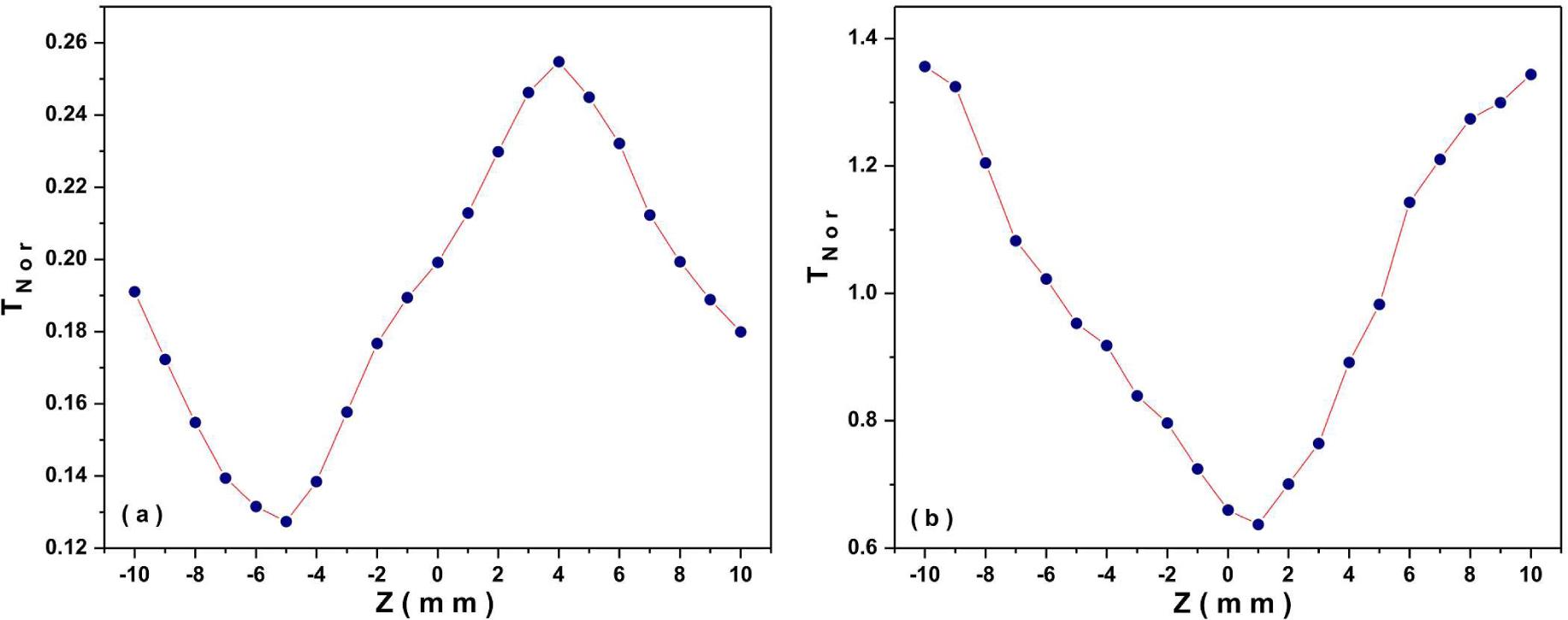 Z-scan transmittance curve with (a) closed and (b) open aperture.