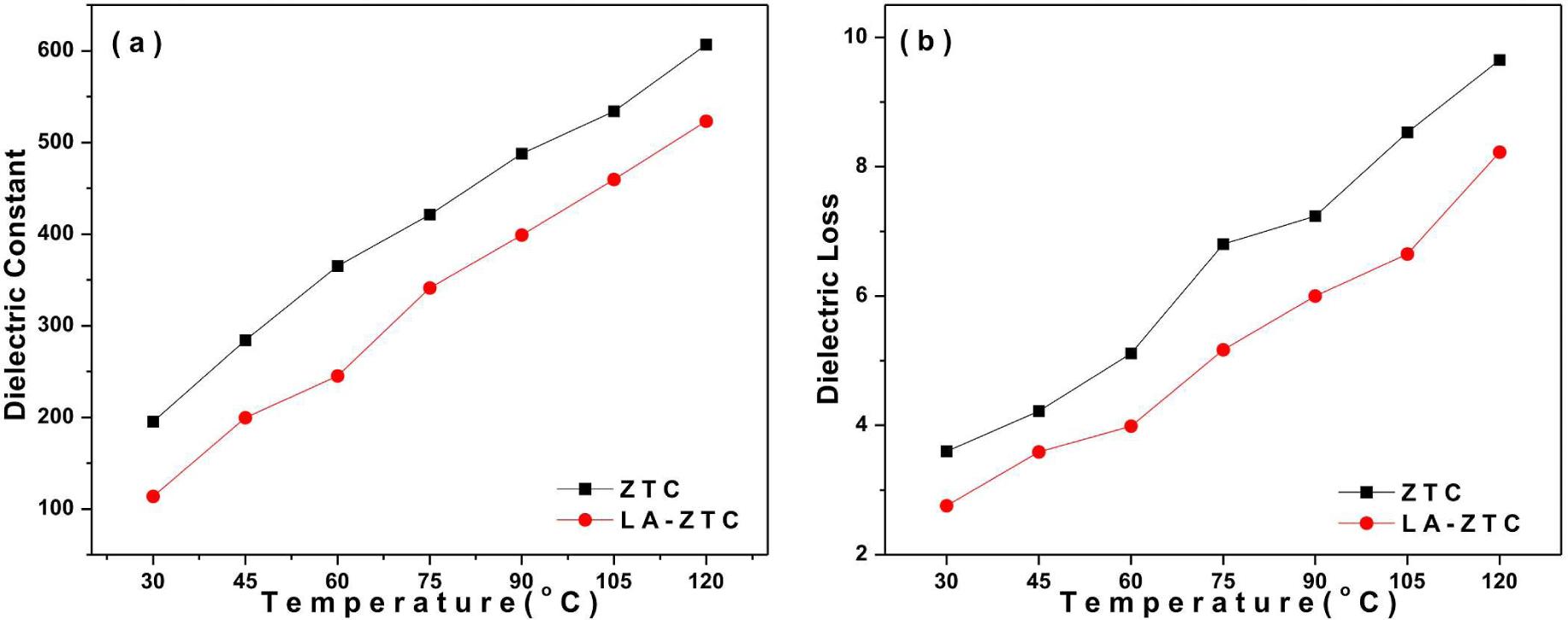 Temperature dependent (a) dielectric constant, (b) dielectric loss.