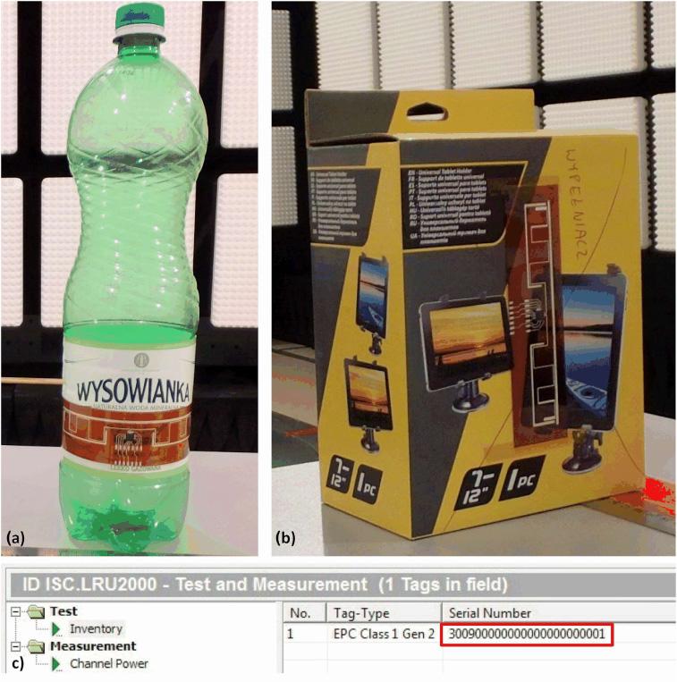 Transponders under application tests: (a) integration with a PET bottle, (b) integration with a cardboard box, (c) record of the serial number in the RWD application.
