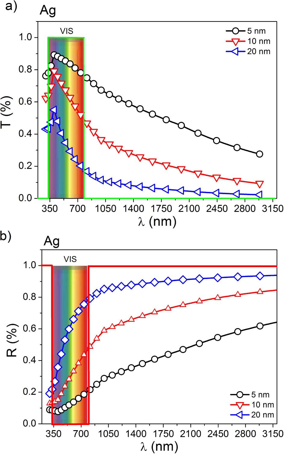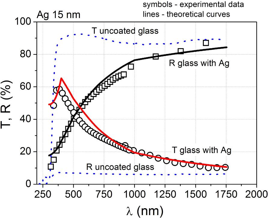 Transmission and reflection characteristics of 15 nm silver thin films deposited on glass by electron beam evaporation. Theoretical curves were designed using Film Star Design software.