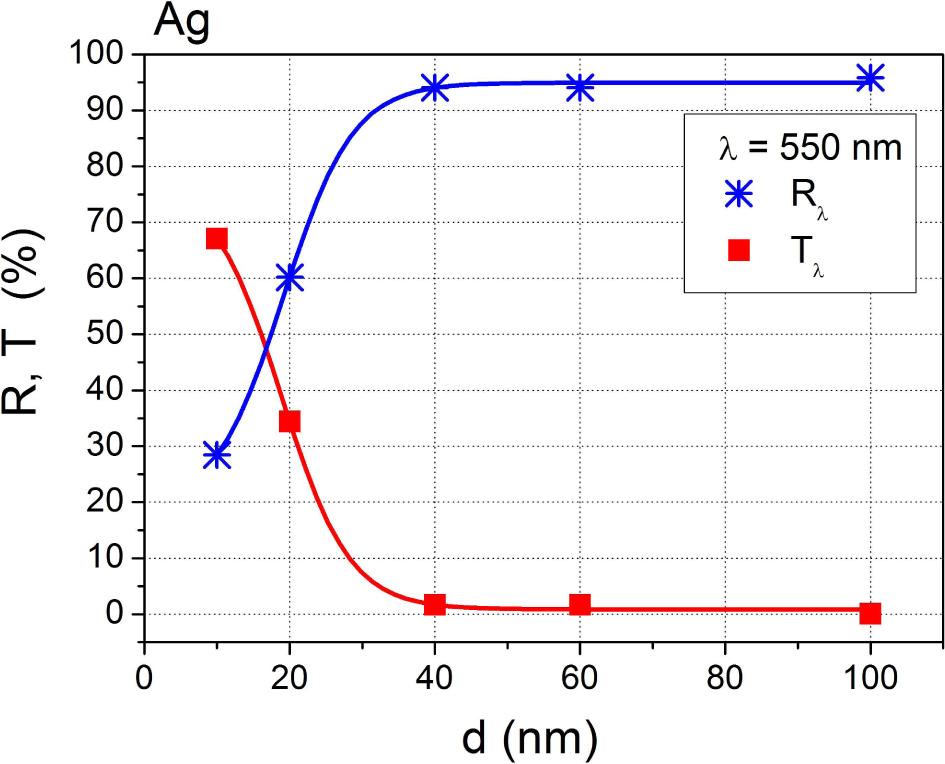 Metals are well known glazing materials that block radiant heat, however, in general they are not transparent in the visible spectral range in the solid state form. Fig. 1 shows designed exemplary spectral characteristics of transmission (T) and reflection (R) coefficients of silver with different thickness and in Fig. 2 the dependence of T and R on thin film thickness for selected wavelength of 550 nm is presented. All theoretical curves were designed using Film Star Design software [3]. Designing of optical coatings is an efficient way to predict the optical properties of the coatings. Ag thin films with the thickness up to 10 nm seem to be transparent enough in the visible range (Fig. 1). Simultaneously, their glazing property in the infrared range is better with increasing thickness (Fig. 2). The best designing results (a compromise between reflection and transmission) for a single Ag thin films were obtained for the thin film with 15 nm thickness (Fig. 2).