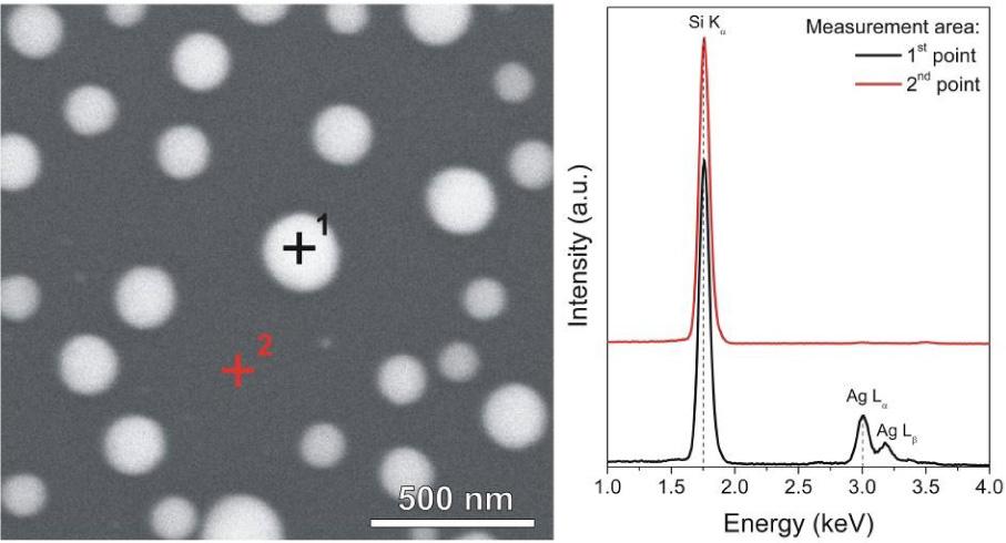 Additional EDS measurements were performed in two different places on the sample surface, marked in Fig. 7. In the area of 1st point these studies revealed that it consisted mainly of silver (AgLα) and silicon (SiKα). Therefore, it can be concluded that visible particles are pure silver, while silicon signal is related to the SiO2 substrate. In turn, measurement in the 2nd point area showed that this peak is related to silicon species only.