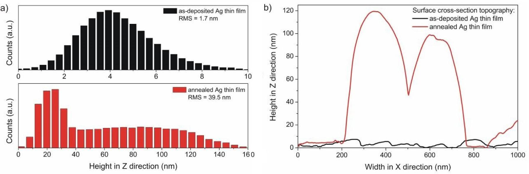 AFM analysis results: a) height distribution of grains size in Z direction and b) cross-section topography of as-deposited and heated Ag thin films.