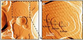 The AFM measurement on the KBr(1 0 0) surface, which was made just after cleaving the crystal, unveiled terraces of the width between 0.1 and 2 µm, with a majority of ~1 pm ones. Their height is 0.33 nm, which corresponds to half the lattice parameter (1/2 a) of KBr. Thus, the surface is smooth and alternately decorated with K+ and Br- ions. A number of defects appeared, such as screw and edge dislocations, and KBr voids (Fig. 1a). We focused our attention on crystal dissolution progress in the site of a left-handed screw dislocation (Fig. 1b). It was of helix type with three coils and a base diameter of about 5 µm. The width of helical terraces ranged from 0.5 to 1.5 µm. The magnitude of Burgers vector for the dislocation was 1/2 a.
