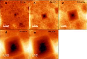 Evolution of the etch pit versus exposure to a weak isopropanol solution of water. Exposure time in minutes is given in the upper right corner of each image. Area of scan is 9.0 × 9.0 µm2. Z scales of images (a-e) are described from dark (0 nm) to light 38, 39, 32, 36 and 25 nm, respectively.