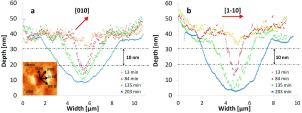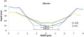 Influence of tip scanning on the shape of a hollow. Profiles along [1 1 0] and [1 1 0] directions were observed in 203 minutes of exposure to the solution.