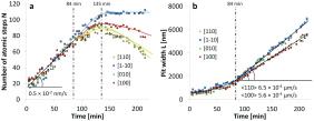 (a) Number of atomic steps and (b) base side width of the etched hollow as a function of time along 〈1 1 0〈 and 〈1 0 0〉 directions.