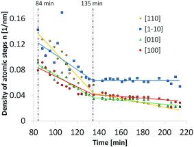 Density of atomic steps as a function of time along 〈1 1 0〉 and 〈1 0 0〉 directions.