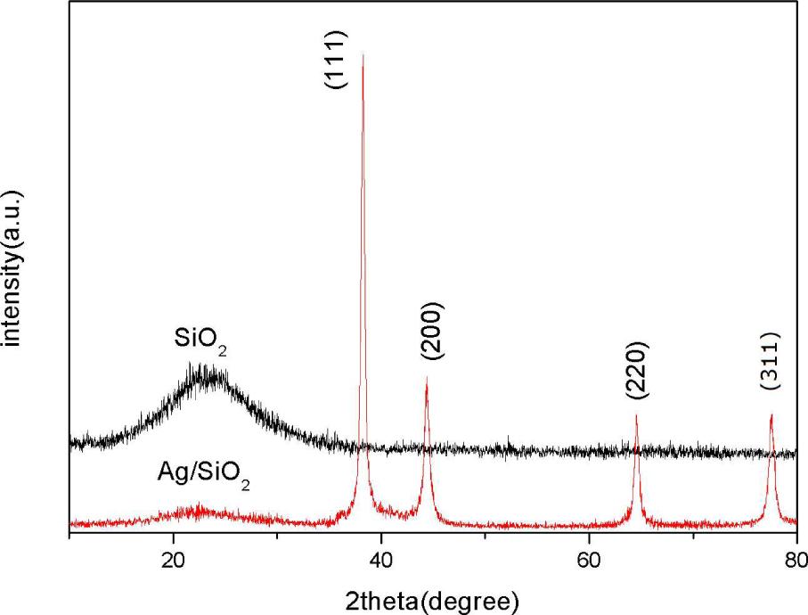 The wide-angle X-ray diffraction (XRD) patterns of the obtained SiO2 microspheres and SiO2/Ag composites are illustrated in Fig. 1. For pure silica particles, there is only a broad scattering maximum centered at 22.5°, corresponding to amorphous silica [15, 17]. Yet, for core-shell composites, except amorphous silica characteristic diffraction peak, it also exhibits four well-resolved diffraction peaks at 2θ angles of 37.9°, 44.1°, 64.3° and 77.2° in the range of approximately 10° to 80°, which can be indexed to the (1 1 1), (2 0 0), (2 2 0), and (3 11) reflections of face-centered cubic metal silver (JCPDS Card No. 87-0720), indicating that the Ag nanoparticles with high crystallinity could be obtained on the surface of SiO2. In addition, we also can find that the peaks are a little broader than that of bulk silver because the silver grain size is relatively small.