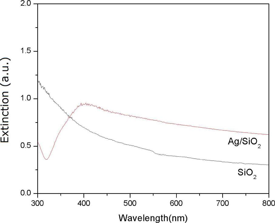 UV-Vis absorption spectra of SiO2 and Ag/SiO2 composites.