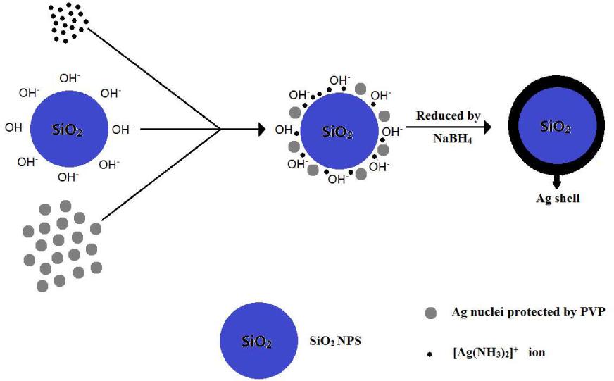 Fig. 5 describes the mechanism of fabrication of the SiO2/Ag core-shell composites. In the first step, because the amount of NaBH4 is inadequate, both PVP stabilized Ag nuclei (zeta potential ~ +2.3 mV) and surplus [Ag(NH3)2]+ ions are ex-isting in the mixture. After the addition of silica microspheres, PVP stabilized Ag nuclei and surplus [Ag(NH3)2]+ ions are adsorbed on the surface of the silica spheres (zeta potential ~ -2.3 mV) via chemisorption and electrostatic attraction [12, 24, 25]. After that, when additional NaBH4 is dropped into, the reduction process would be initiated. In this process, [Ag(NH3)2]+ ions adsorbed on the surface of silica spheres are reduced to Ag nanoparticles. The newly reduced Ag and PVP stabilized Ag nuclei conjugated on the silica surface act as the seeds which provide nucleation sites for the new growth of silver shell [18, 26]. The remaining [Ag(NH3 )2]+ ions in the solution are further reduced by NaBH4 and Ag nanoparticles grown gradually on the surface of SiO2, eventually lead to the formation of completely covered silver-coated silica spheres.