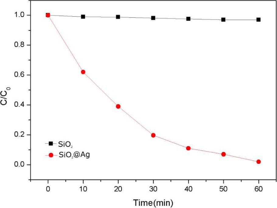 The photocatalytic activities of the SiO2/Ag composites have been investigated by the degradation of methyl orange (MO) under visible light. Pure SiO2 microspheres have been used for comparison.