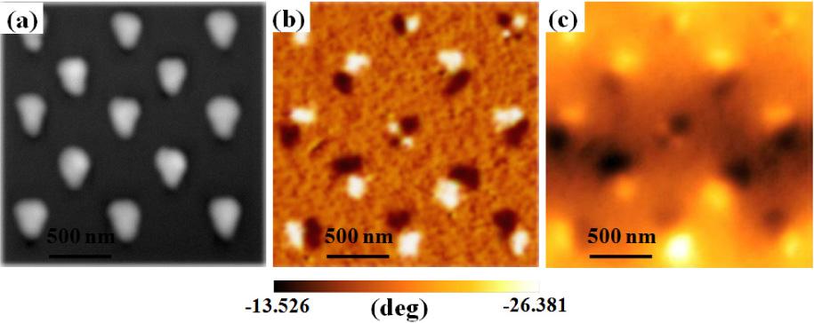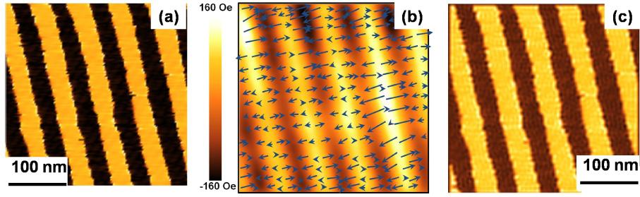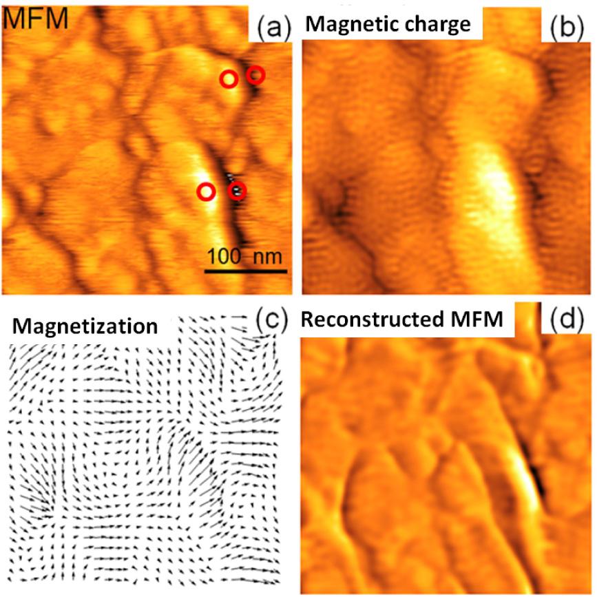 (a) the AFM image, (b) the MFM phase image, and (c) the quantified magnetic field distribution of the triangular shaped FePt pad with in-plane magnetization.(a) The MFM phase image, (b) the quantified perpendicular and in-plane magnetic field components, (c) the simulated MFM image for the perpendicular magnetic recording media.(a) The MFM image, (b) the magnetic charge distribution, (c) the magnetization distribution and (d) the reconstructed MFM image for the LSMO films.