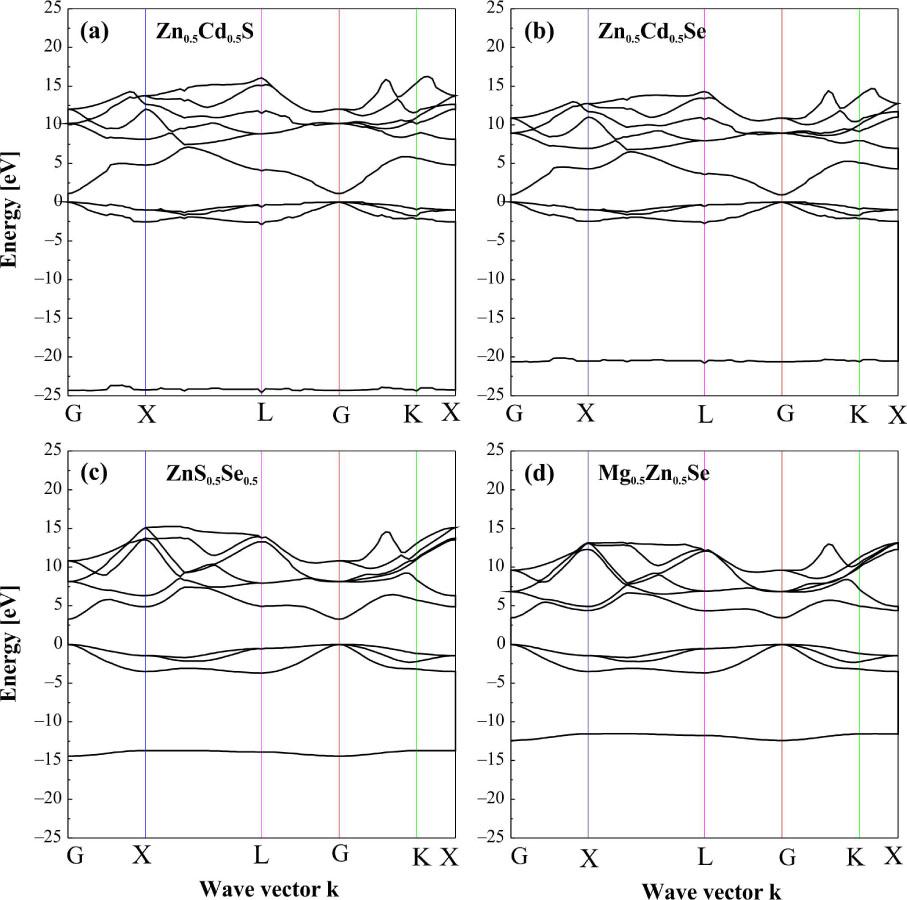 Electronic band structure in zinc-blende (zb) phase for: (a) Zn0.5Cd0.5S, (b) Zn0.5Cd0.5Se, (c) ZnS0.5Se0.5, (d) Mg0.5Zn0.5Se.