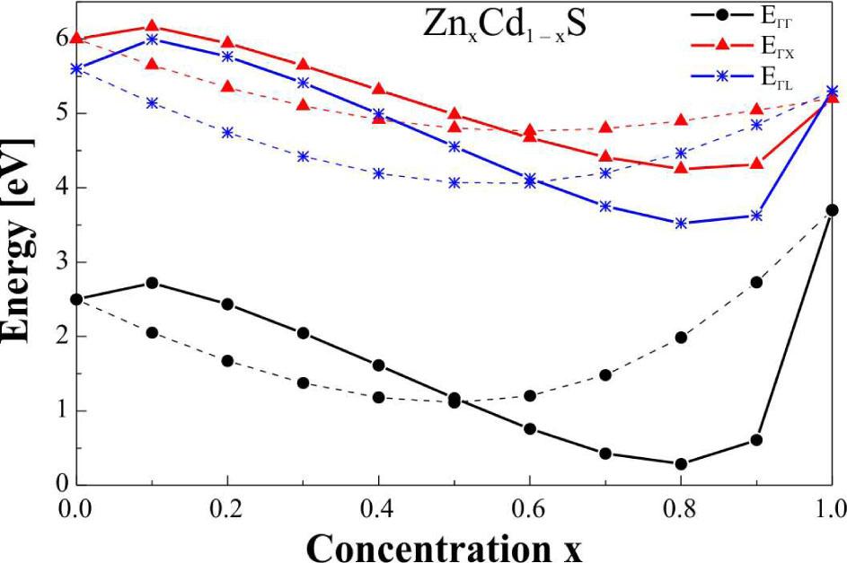 Variation of energy gap with concentration for ZnxCd1−xS in zb phase, obtained with VCA (dashed lines) and improved VCA (solid lines).