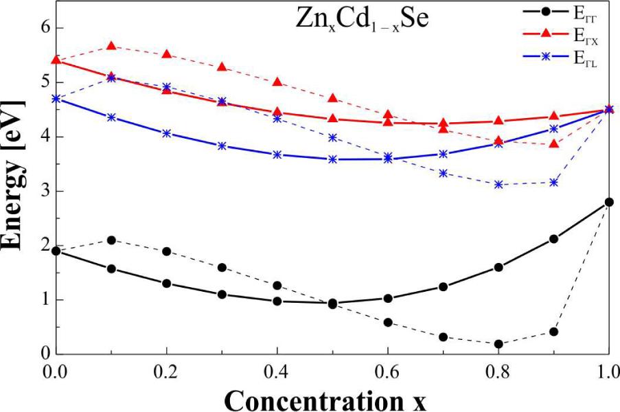 Variation of energy gap with concentration for ZnxCd1−xSe in zb phase, obtained with VCA (dashed lines) and improved VCA (solid lines).