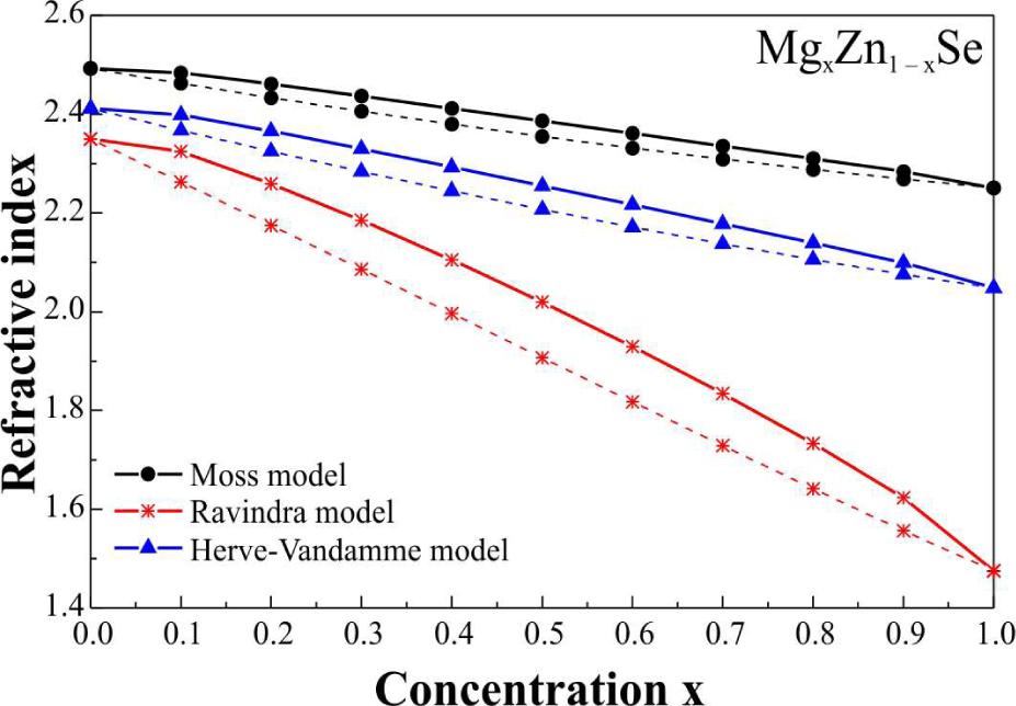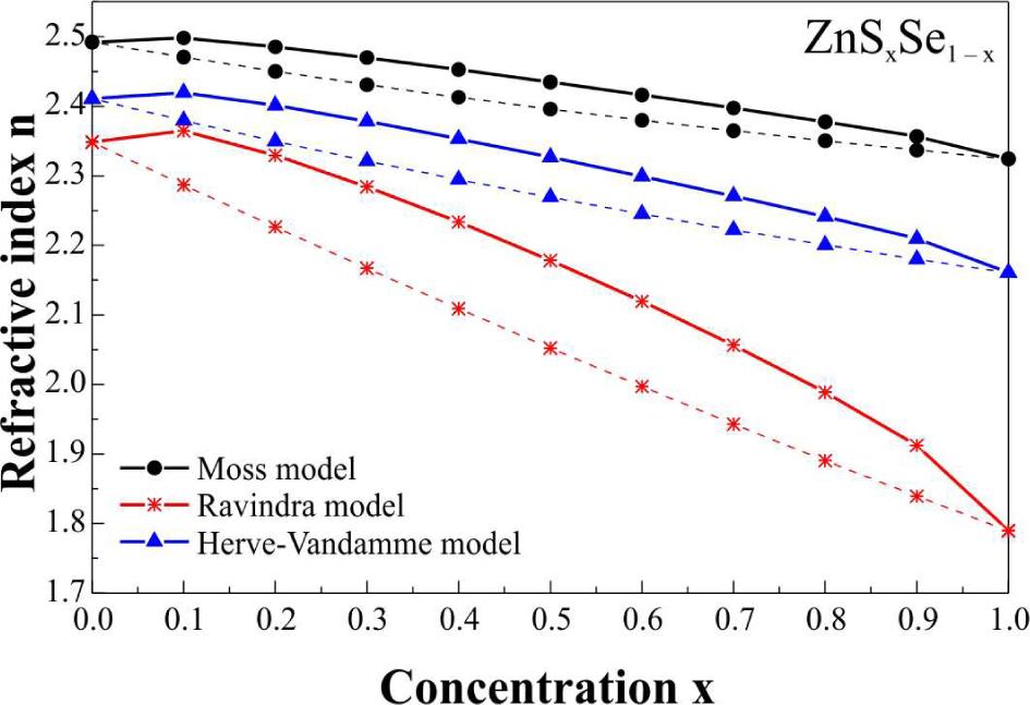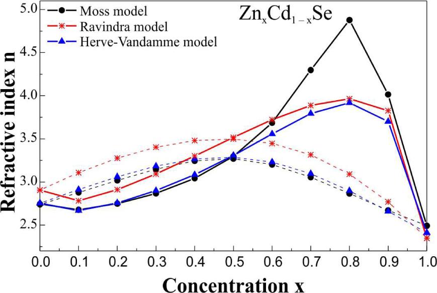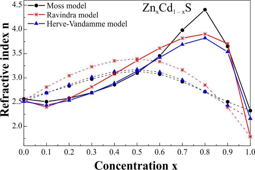 The refractive index (n) is a very important parameter associated to the atomic interactions. Thus, many attempts have been performed in order to obtain simple relationships between the refractive index (n) and the energy gap (EΓΓ) [18, 19]. In this work, we present the calculated variation of n with alloy concentration using the following three models: Moss model [20], Ravindra model [21], and Herve and Vandamme model [22].