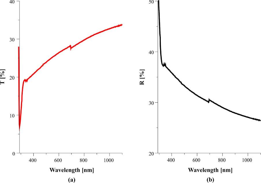 Transmission measurements were performed at room temperature in the range of 200 nm to 1100 nm to obtain information on the optical properties of the Bi2O2.75 thin film deposited on the microscope slides. The transmittance (T) of the thin film can be calculated by using reflectivity (R) and absorbance (A) spectra, from the expression [25]: