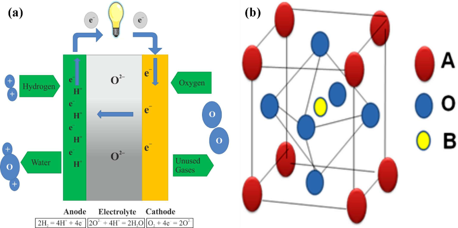 Solid oxide fuel cell (a) operation concept and (b) perovskite structure.