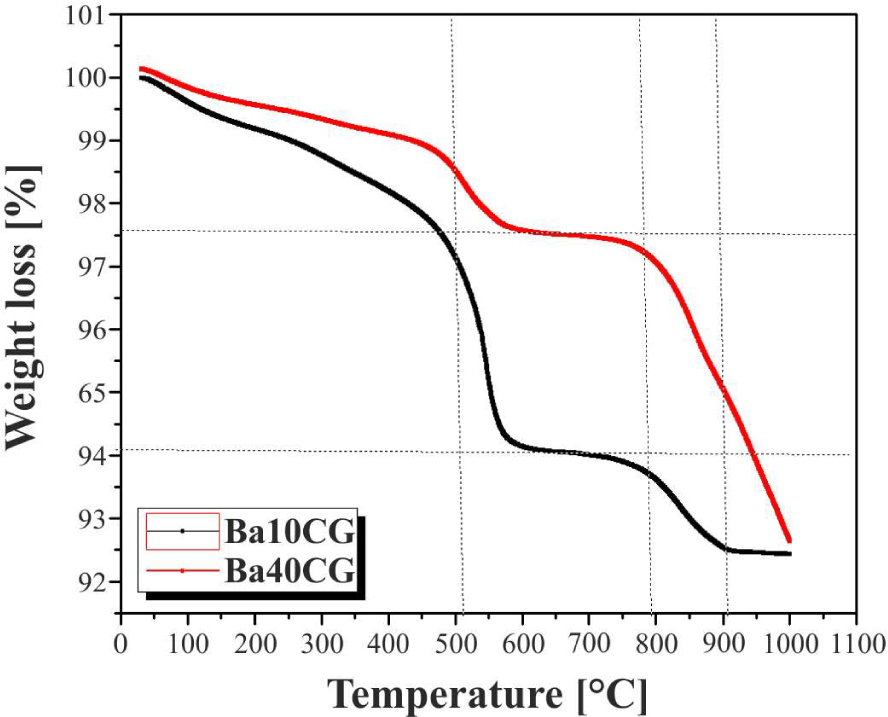 DSC-TGA curve for Ba10CG and Ba40CG calcined at 900 °C.