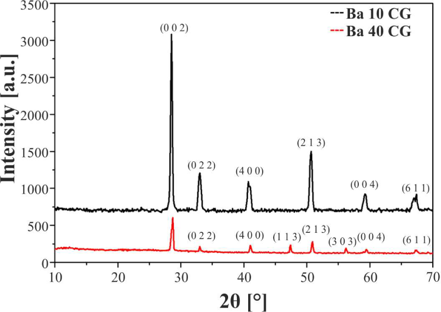 XRD patterns for (a) Ba10CG and (b) Ba40CG pellets sintered at 1400 °C.