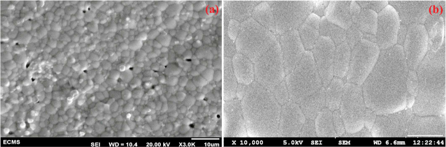 SEM images for (a) Ba10CG and (b) Ba40CG pellet sintered at 1400 °C.