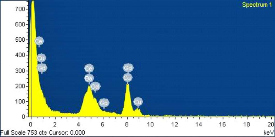 The stoichiometric phase and the presence of Ba, Ce, and Gd precursor elements were identified and confirmed qualitatively by EDS analysis as shown in Fig. 6. The co-precipitation method used to prepare the solid solution resulted in complete precipitation of Gd in BaCeO3 phase [7, 14]. The presence of Cu in EDX may be due to the grid in TEM analyzer.