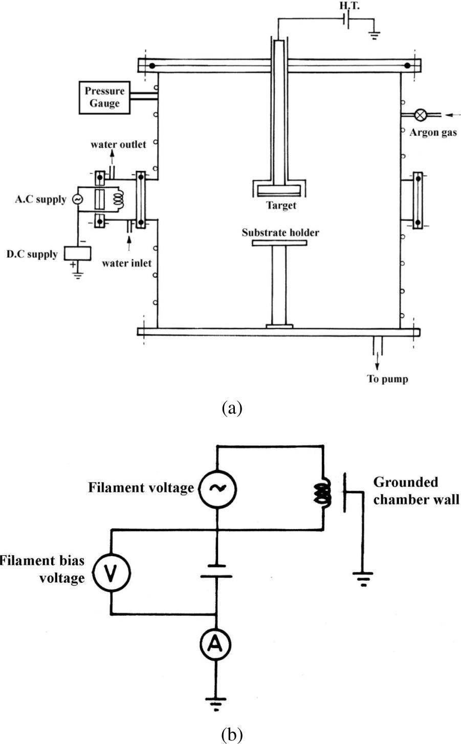 The DC magnetron sputtering system having supported discharge (triode) assembly is shown in Fig. 1a. It consists of water cooled cylindrical chamber of 40 cm diameter and 40 cm height. A 50 mm in diameter (5 mm thick) magnetron cathode assembly is fixed at the center of the top flange of the chamber. A substrate holder (anode) is mounted facing the cathode assembly and kept at a constant distance of 4 cm. The electrical circuit diagram of supported discharge is shown in Fig. 1b. The supported discharge assembly consisting of a tungsten filament mounted onto two low tension (LT) electrodes is attached to the flange. This flange is fixed into a double walled water cooled cylindrical port mounted horizontally to the chamber wall. In order to sustain the discharge, the filament is heated to emission temperatures by passing AC current. A negative DC voltage superimposed onto the electrodes repels the emitted electrons away from the filament. These electrons during their travel away from the filament undergo collisions with the background gases which results in ionization. This creates the additional ions available to sputtering the target in addition to the ions generated during collisions with secondary electrons emitted from the target. This system may also be adapted to the conventional DC sputtering by switching off the power given to filament.