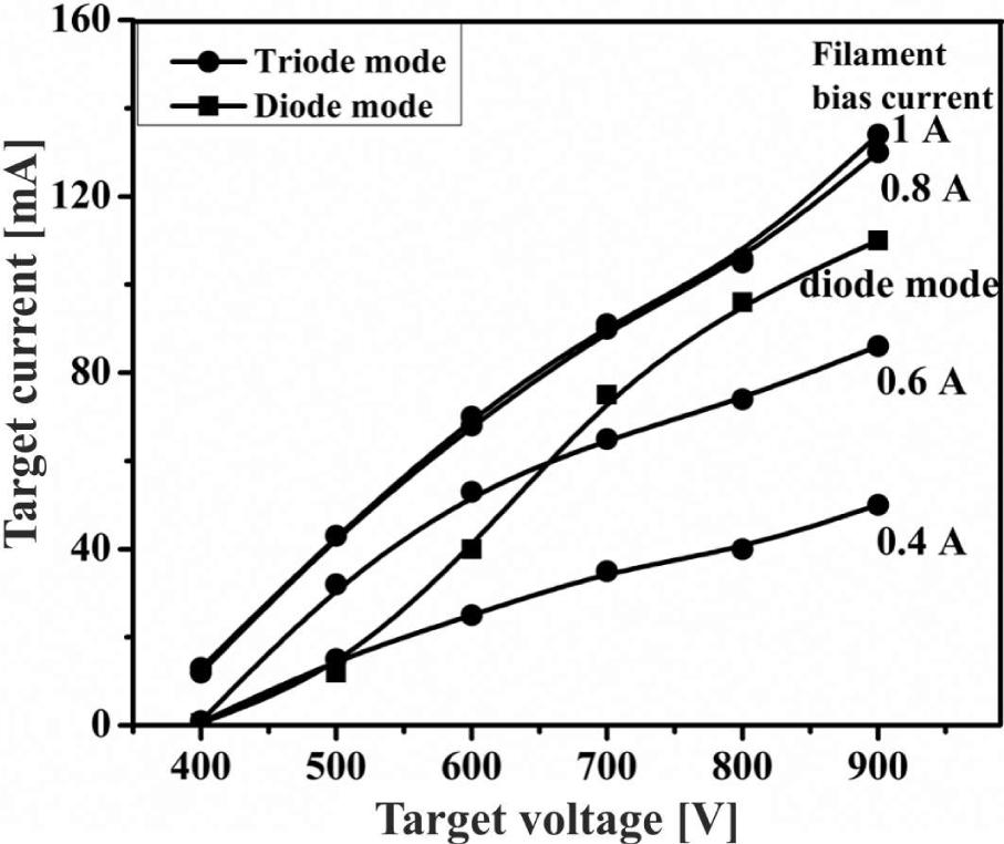 Voltage-current characteristics in diode mode and triode mode at different filament bias currents.