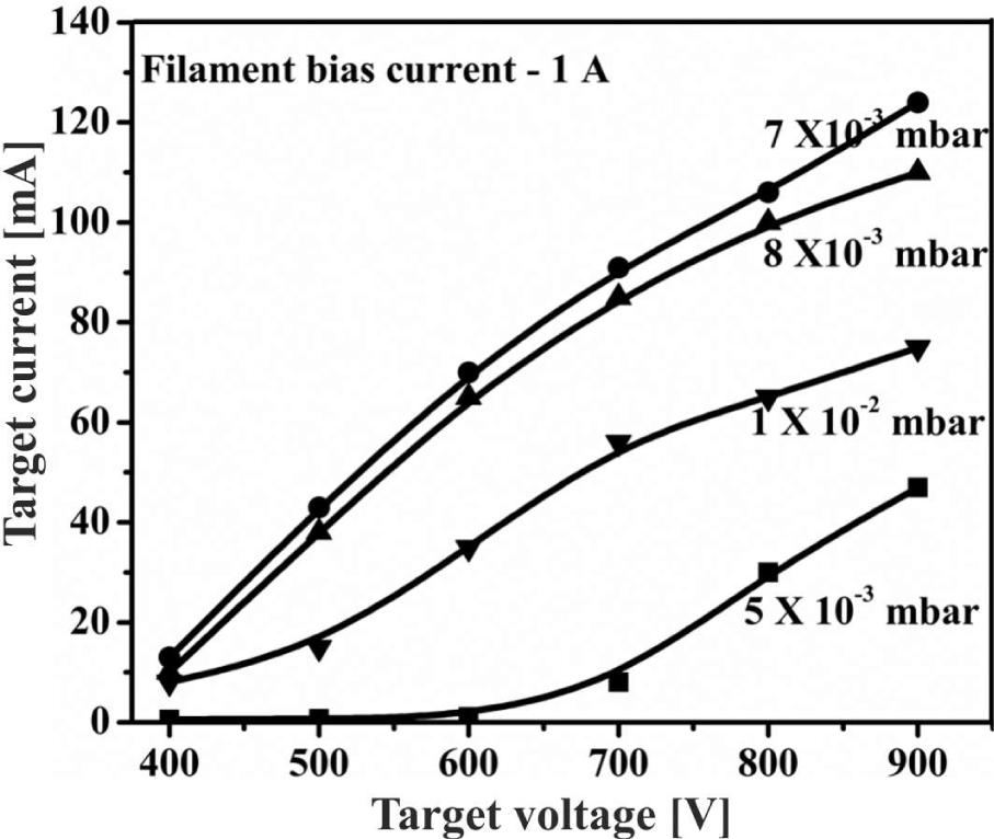 The discharge characteristics (filament bias current/ discharge current in the chamber) were studied at different argon gas pressures (0.5, 0.7, 0.8 and 1 Pa, by keeping the filament AC heating voltage constant (14 V) and at different filament DC bias voltages (10 V, 20 V, 30 V, 40 V, 50 V, and 60 V). The influence of filament bias current/discharge current on the current at sputtering target was measured to evaluate the system performance at different DC target voltages (400 V, 500 V, 600 V, 700 V, 800 V, and 900 V). Different voltages were applied to the magnetron target (titanium disc) to observe the effect of discharge current at the target.