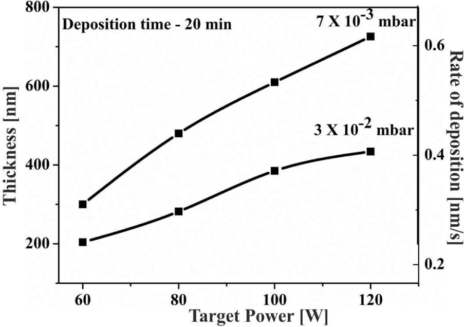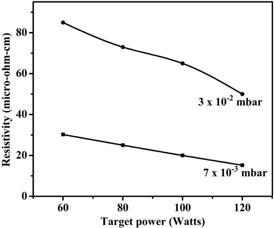 where T is the room temperature in [K], P is argon sputtering pressure in [Pa] and δm is the molecular diameter in [cm]. From the above equation, when sputtering pressure is high, the mean free path is short; the sputtered atoms undergo higher number of collisions resulting in loss of sputtered atoms due to scattering. Hence, lesser number of atoms arrives at the substrate. At lower pressure the mean free path is relatively high, so the number of collisions decreases and the number of atoms reaching the substrate is high. As a result it is possible to achieve higher thicknesses with decreasing pressure for a given target power [19].