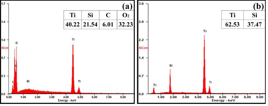 EDS spectra for the Ti thin films deposited at (a) 3 Pa and (b) 0.7 Pa.