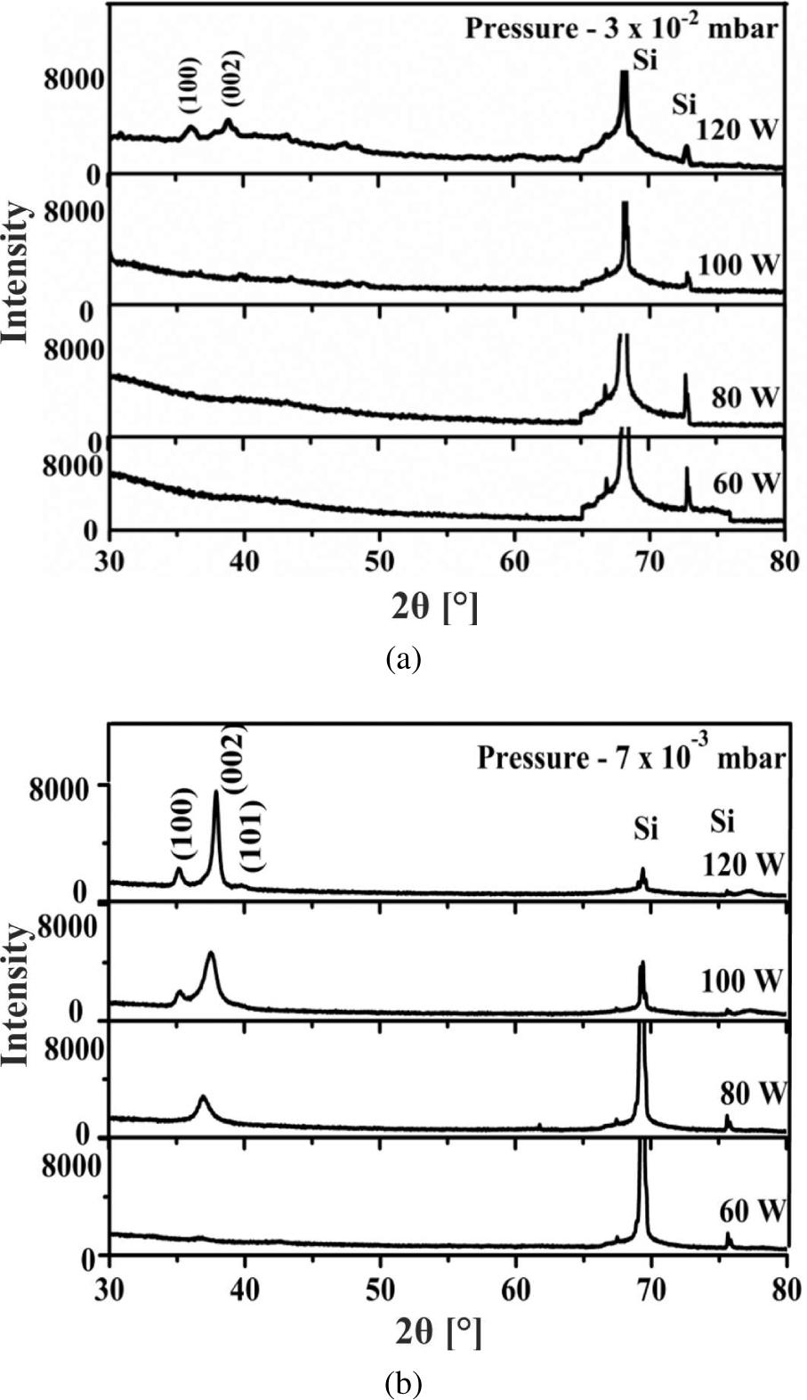 Structural variations of Ti films deposited in diode mode at a pressure of 3 Pa and in supported discharge mode at a pressure of 0.7 Pa at different powers are shown in Fig. 6a and Fig. 6b, respectively. From Fig. 6a, the films deposited at a power up to 100 W do not show any crystallinity. Only at a power of 120 W the films show crystallinity with preferred orientations of (1 0 0) and (0 0 2). In the films deposited at lower pressure of 0.7 Pa with supported discharge, the onset of crystallinity starts at the power of 80 W with a preferred orientation of (0 0 2), while no crystallinity has been observed in the films prepared at 60 W. Further increase in power to 100 W resulted in another preferred orientations of (1 0 0) along with (0 0 2). At a power of 120 W, the intensity of the peaks increased with the appearance of (1 0 1) peak [20]. Similar results were obtained by Chawla et al. [9] who prepared Ti thin films by DC magnetron sputtering at substrate temperature of 200 °C. Junga et al. [3] deposited Ti thin films with grid-attached magnetron sputtering in which the substrate bias of 150 V was applied. Fontana et al. [1] prepared Ti thin films by triode magnetron sputtering at substrate temperature of 100 °C and substrate bias of 300 V. Golan et al. [13] deposited Ti thin films using triode sputtering by biasing the substrate and at substrate temperature of 50 °C.