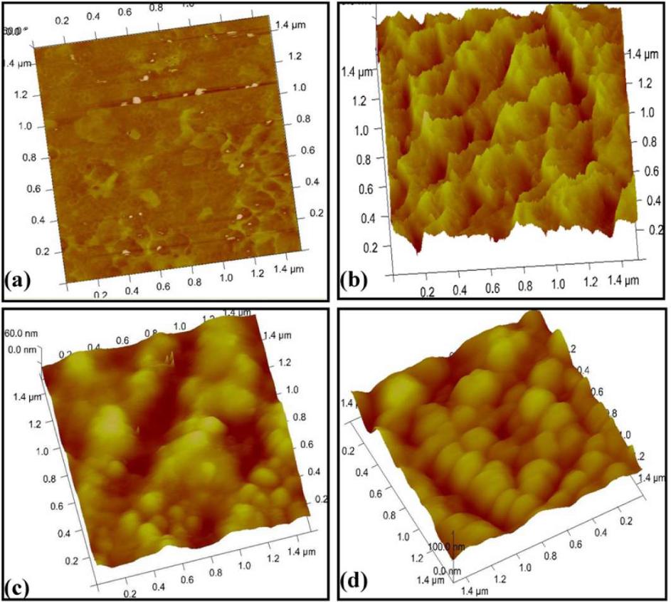 AFM images of Ti films deposited in supported discharge system at the target power of (a) 60W, (b) 80 W, (c) 100 W and (d) 120 W.