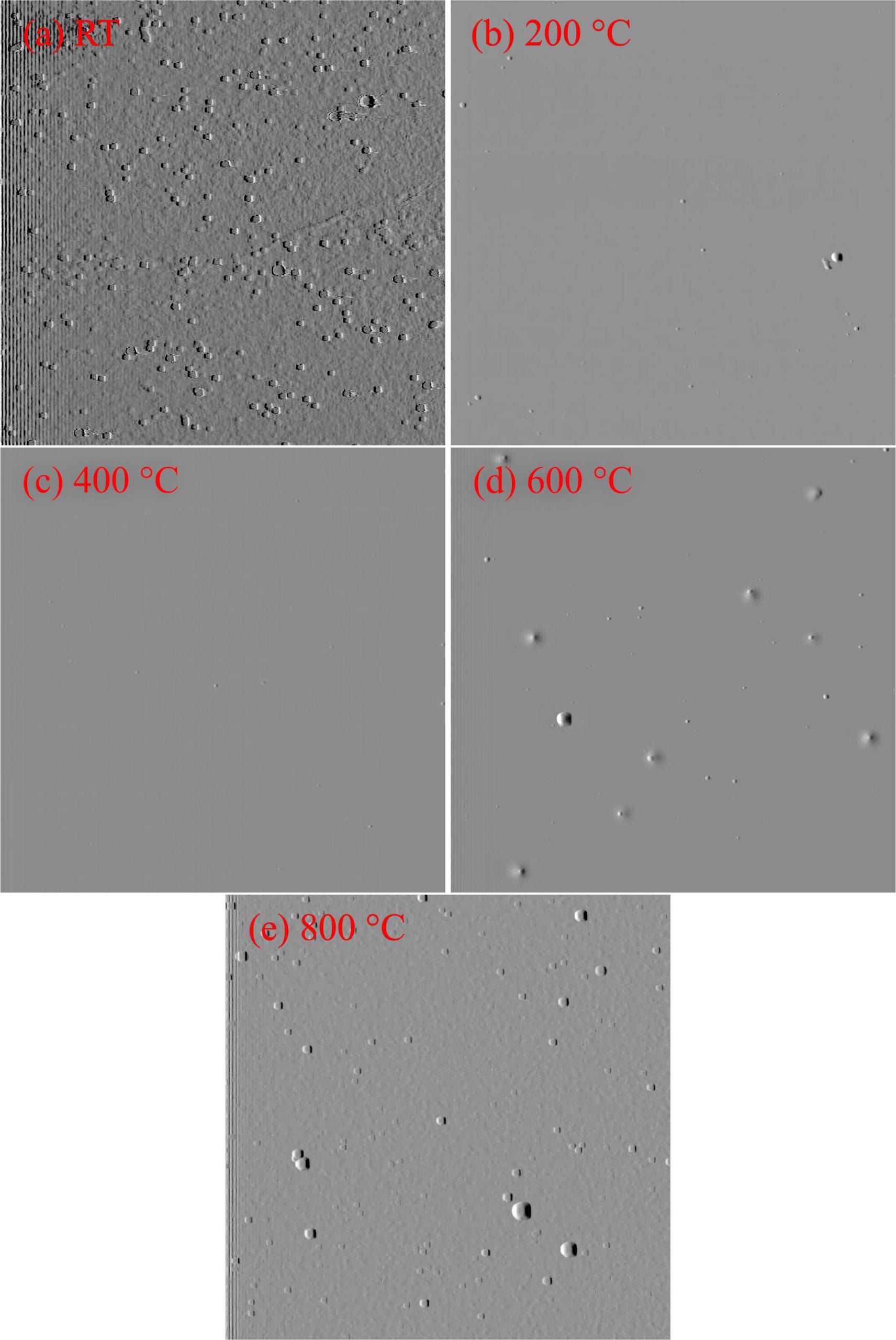AFM 20 μm × 20 μm images of the film surface topography are presented in Fig. 1. It can be noticed that the surface topography depends strongly on the substrate temperature. In general, the coating surface is smooth, however, a different number of droplets is observed depending on the substrate temperature. The coatings obtained at room temperature and at 600 °C and 800 °C (Fig. 1a, Fig. 1d, Fig. 1e, respectively) show the highest number of droplets. The coatings obtained at 200 °C and 400 °C demonstrate the best surface quality with almost no droplets being visible in these cases.