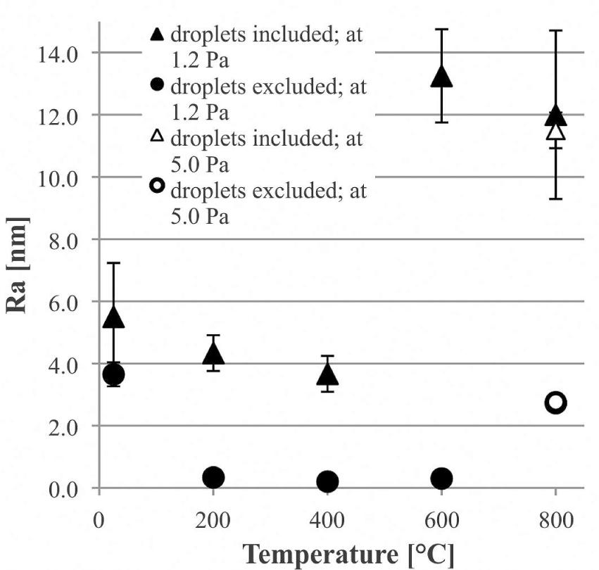 The good quality of the samples obtained at 200 °C and 400 °C has also been confirmed by the results of the roughness measurements. Fig. 2 presents the results of roughness measurements carried out using surface profilometry and AFM methods. The former measurements included the droplets, whilst the AFM measurements were performed between the droplets. It can be seen that the presence of droplets significantly increases the roughness of the coatings obtained at 600 °C and 800 °C which coincides well with the surface images. When analyzing the roughness of the coatings measured between the droplets, it can be observed that the coatings obtained at 200 °C and 600 °C are the smoothest having an Ra parameter of 0.2 nm to 0.3 nm. The roughness of the coatings obtained at RT and at 800 °C is 10 to 20 times higher. These observations suggest that there could be an optimum range of substrate temperature to obtain the best surface quality. This is in agreement with the results of other studies [18–20]. For example, Liu et al. [21] observed similar phenomena for ZnO coatings obtained by the PLD method. This was explained on the basis of enhanced atomic mobility and diffusion on the surface of the film at higher temperature. As a result, smoother coatings can be obtained. However, when the substrate temperature is too high, the adatoms with too high kinetic energy collide quickly with each other and are reevaporated. As a result, a mass of dislocations in the thin film induces higher roughness. Taking into account that the melting temperature of ALON is of the same order as that of ZnO, a similar phenomenon may also be expected for ALON.