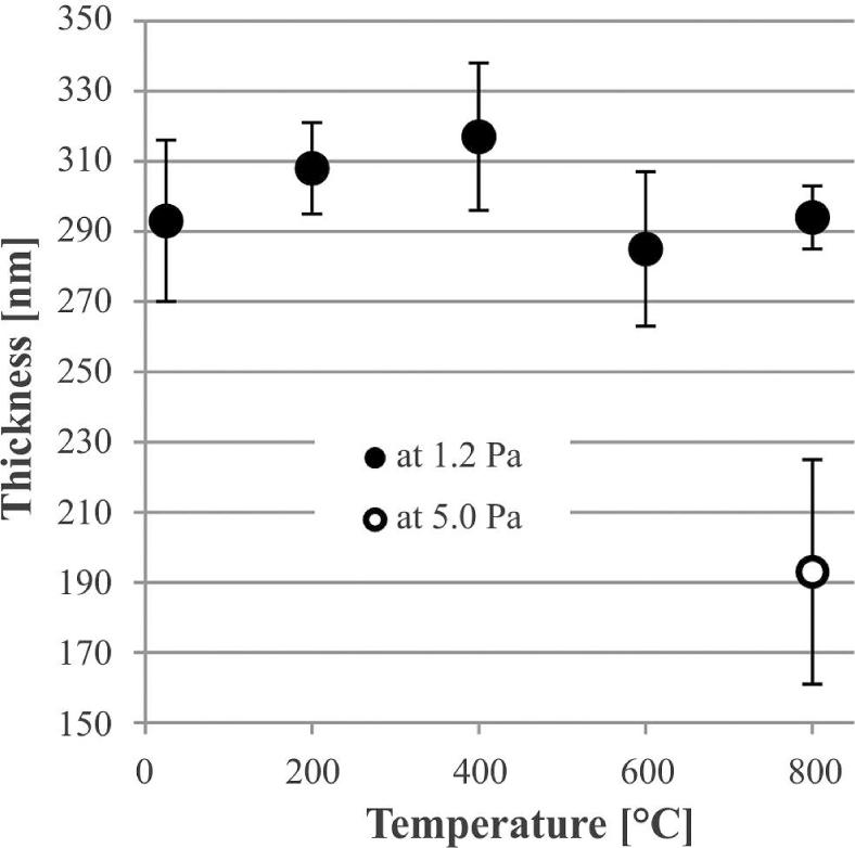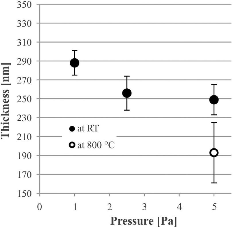 The results presented in Fig. 8 demonstrate that an increase in the gas pressure leads to a decrease of the coating thickness from 290 nm to 250 nm. A similar tendency was shown by other authors [23, 25, 28]. It can be observed that the temperature increase reduces the thickness even more.